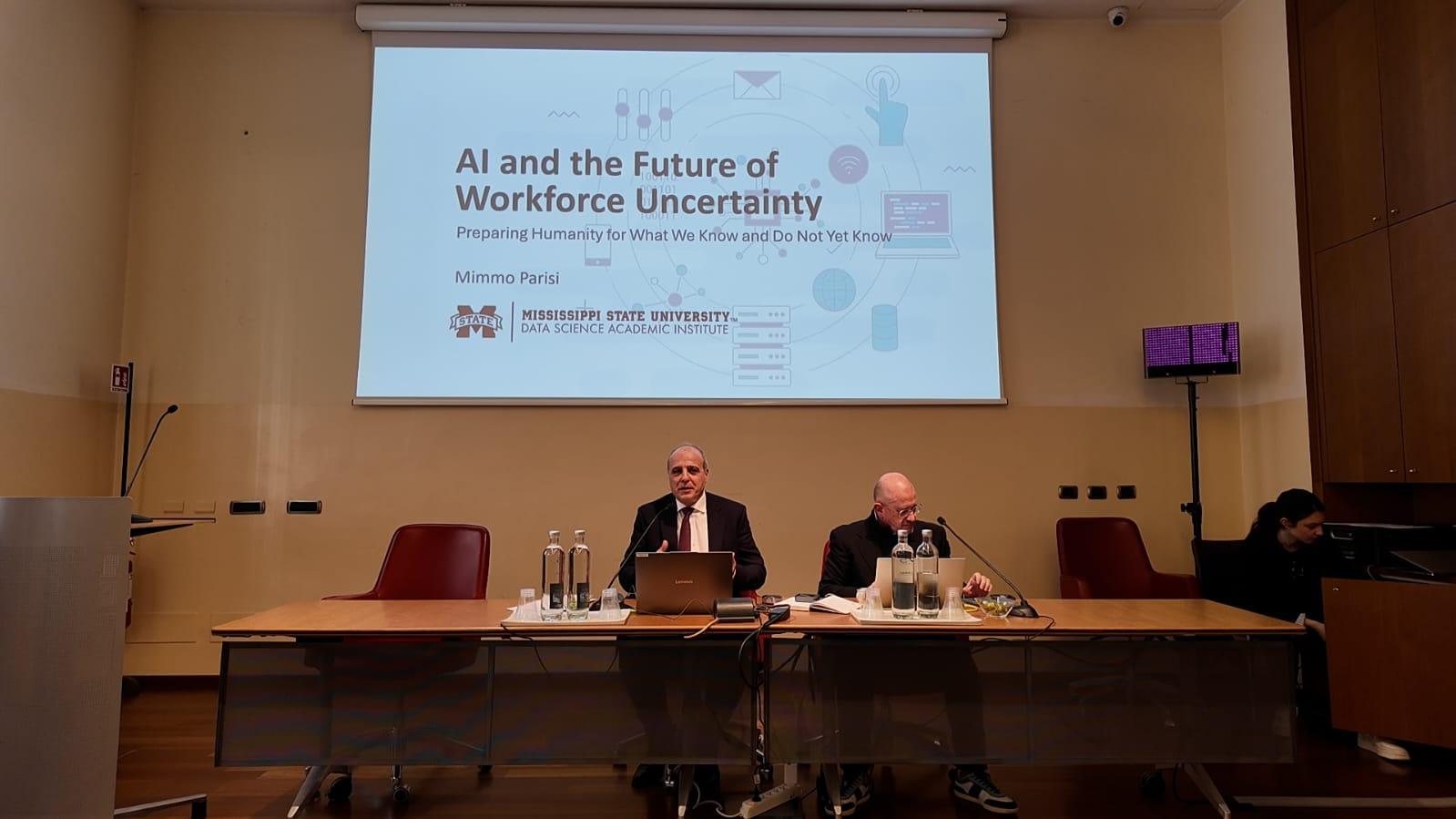 On March 10, 2026 Mimmo Parisi, Director of the Data Science Academic Institute at Mississippi State University, presented a talk titled, "AI and the Future of Workforce Uncertainty: Preparing Humanity for What We Know and Do Not Know" at the conference "Learning by Doing: Ethics and Education in the Era of Artificial Intelligence" sponsored by the Observatory for Integral Intelligence at the Università Pontificia Antonianum in Rome, Italy. The conference brought together leaders from education, industry, and government to consider AI and the human future.